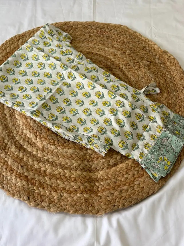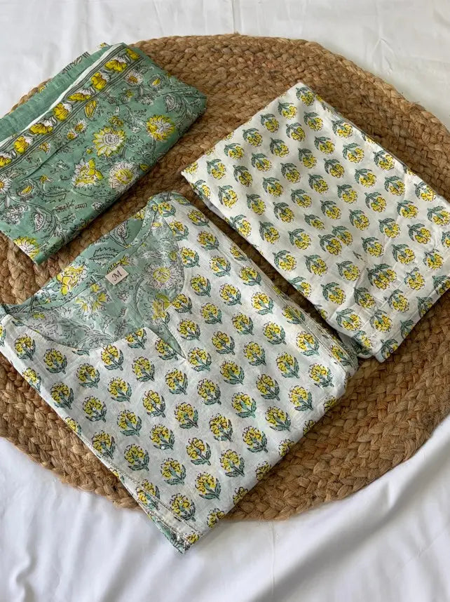 | Feel the freshness of this Mint Green self-print cotton kurta with pant set with dupatta, it has round neck with the covered with gota patti work and bottom of Pant in self-print. Dupatta corner are coved with self printed border it looking gorgeous for that exclusive look or just go simple and stunning, keeping the look as it is. Mix and match with your favorite colors and you will always look like and ethereal diva in this mint green beauty. • Color : Mint Green • Neck Type : Round Neck • Prints Patterns : Floral • Hemline : Straight • Sleeve : Three-Quarter Sleeves • Occasion : Festival • Fabric Purity : Pure • Sleeve Type : Regular Sleeves • Care Instruction : Hand Wash • Waistband : Partially Elasticated • Slit Detail : Side Slits • Length : Calf Length • Base Design : Printed • Ornamentation Type : Gotta Patti • Kurta Shape : Straight • Top Fabric : Pure Cotton • Bottom Fabric Pure Cotton • By Type : Kurta Sets/Suit Sets • Bottom Type : Trousers • Bottom Fabric : Printed • Bottom Pattern : Pure Cotton • Dupatta : With Dupatta |