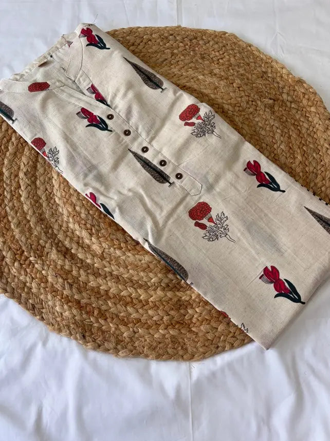 | With So Many Occasions And Marriages Around The Corner, We Need New Outfit For Every Occasion Without Repeating The Old One, If You Are Also In Dilemma Then Has Just The Perfect Choice For You, Kurta Is Just What You Need, It Has Beautiful Embroidery Work In The Front Neck And Umbrella Type Dress Gather At The Bottom Part, Assembled With Doris and Latkan To Add The Extra Style Factor. For A Style Tip Just Add A Glamorous Pair Of Earrings And You Are All Set To Shine. • Color : Off white • Material : Cotton • Neck Type : Mandarin collar • Prints Patterns : Solid • Hemline : Straight • Sleeve : Three Quarter • Occasion : Casual Wear • Fabric Purity : Pure • Sleeve Type : Regular Sleeves • Care Instruction : Hand Wash • Waistband : NA • Slit Detail : NA • Length : Calf Length • Base Design : Solid • Ornamentation Type : Embroidery • Kurta Shape : A-Line • Fabric : Cotton • By Type : Kurta |